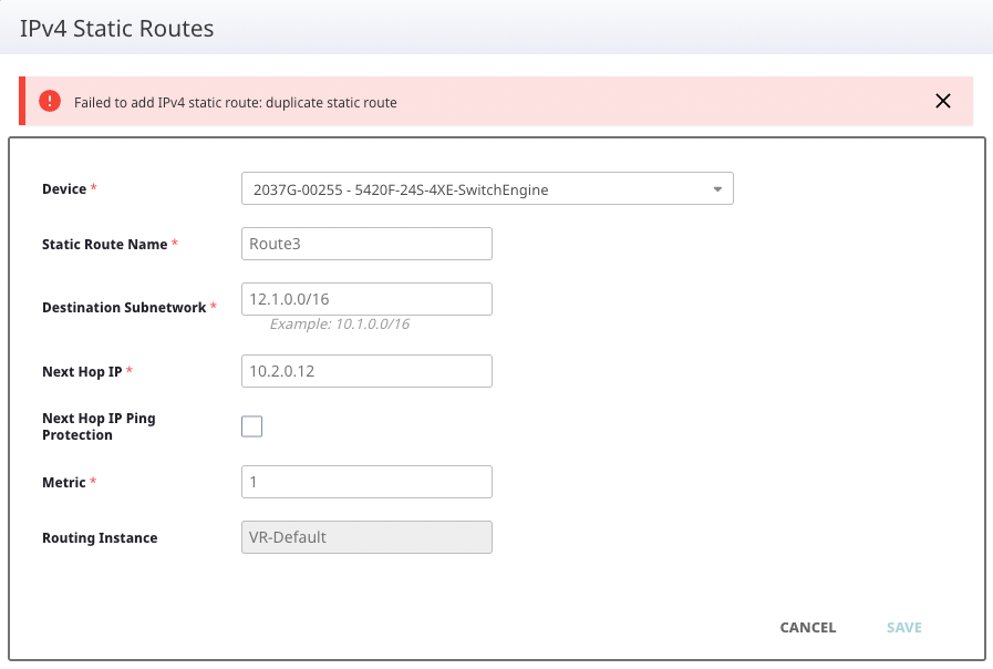 | Routing Instance (Read-only) | Shows the Routing Instance. Note: IPv4 static routes can