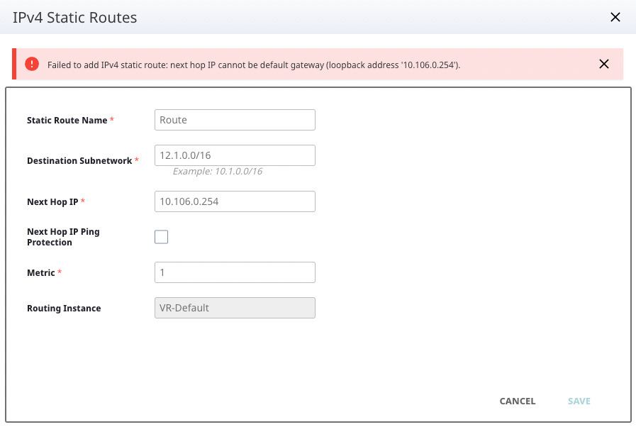 When creating an IPv4 static route, next hop IP cannot be default gateway defined within Management Interface Settings using Static Address option.