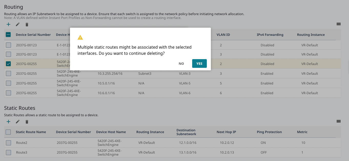 All IPv4 static routes created from a network policy for a specific device are displayed and can be edited also from the device-level page of that device and vice-versa.