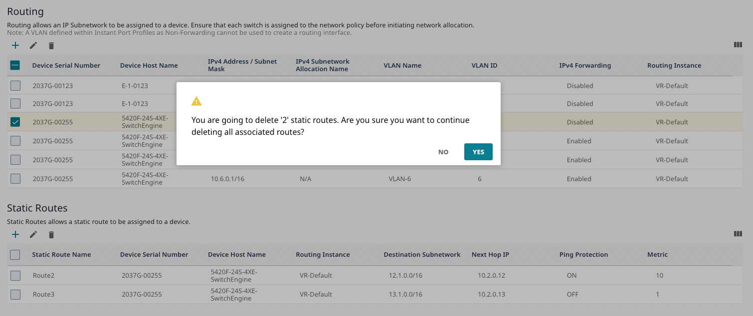 By selecting a device when creating an IPv4 static route, routing feature allows device-level configuration to be performed from a network policy. The entries from Static Routes table will generate delta only for those devices selected when the IPv4 static routes have been created.